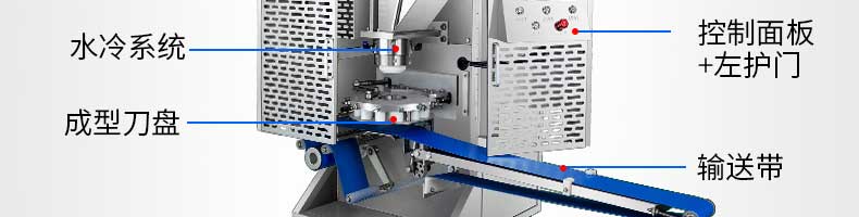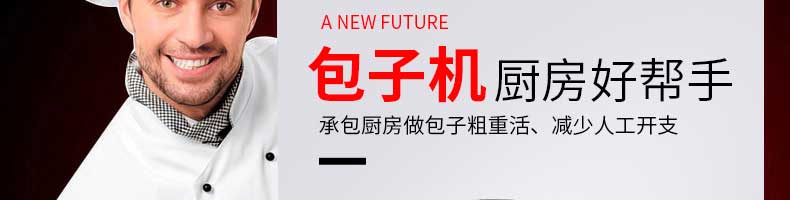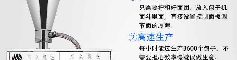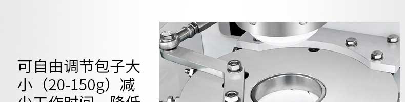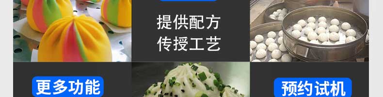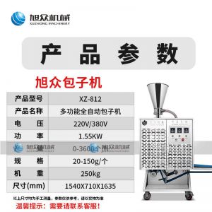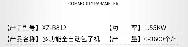 名稱XZ-B812型多功能包子機 電源220V/380V 功率1.55KW 產量0-3600個/h 尺寸1540×710×1635mm 重量250kg 規格25-130g/個 其他