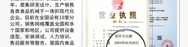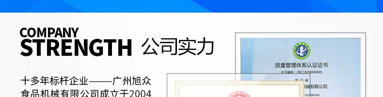 廣州旭眾食品機械有限公司是一家集科研開發,生產設計,營銷服務為一體的現代化生產企業。現代化生產車間,精湛制造技術,所產機械歷經市場重重考驗,不斷贏得海內外客戶的贊譽。