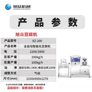 名稱XZ-300型氣動壓榨豆腐機 電源220/380V 功率磨漿功率1.5KW,煮漿功率24KW,總功率25.65KW 產量豆漿產量300kg/h,豆腐產量150kg/h 尺寸1750X850X1300mm 重量聯系銷售員 規格聯系銷售員 其他成型方式:氣動
