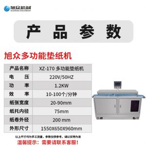 名稱XZ-170多功能墊紙機 電源220V/50Hz 功率1.2kw 產量10-100個/分鐘 尺寸1550*650*960mm 重量聯系銷售員 規格紙張寬20-90mm,內徑75mm,外徑200mm 其他