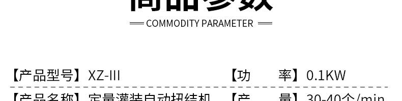 名稱XZ-III定量灌裝自動扭結機 電源220V 功率0.1KW 產量30-40個/min 尺寸700×800×1600mm 重量165kg 規格50g-1000g 其他【料斗容量】23/63升(標配23L)