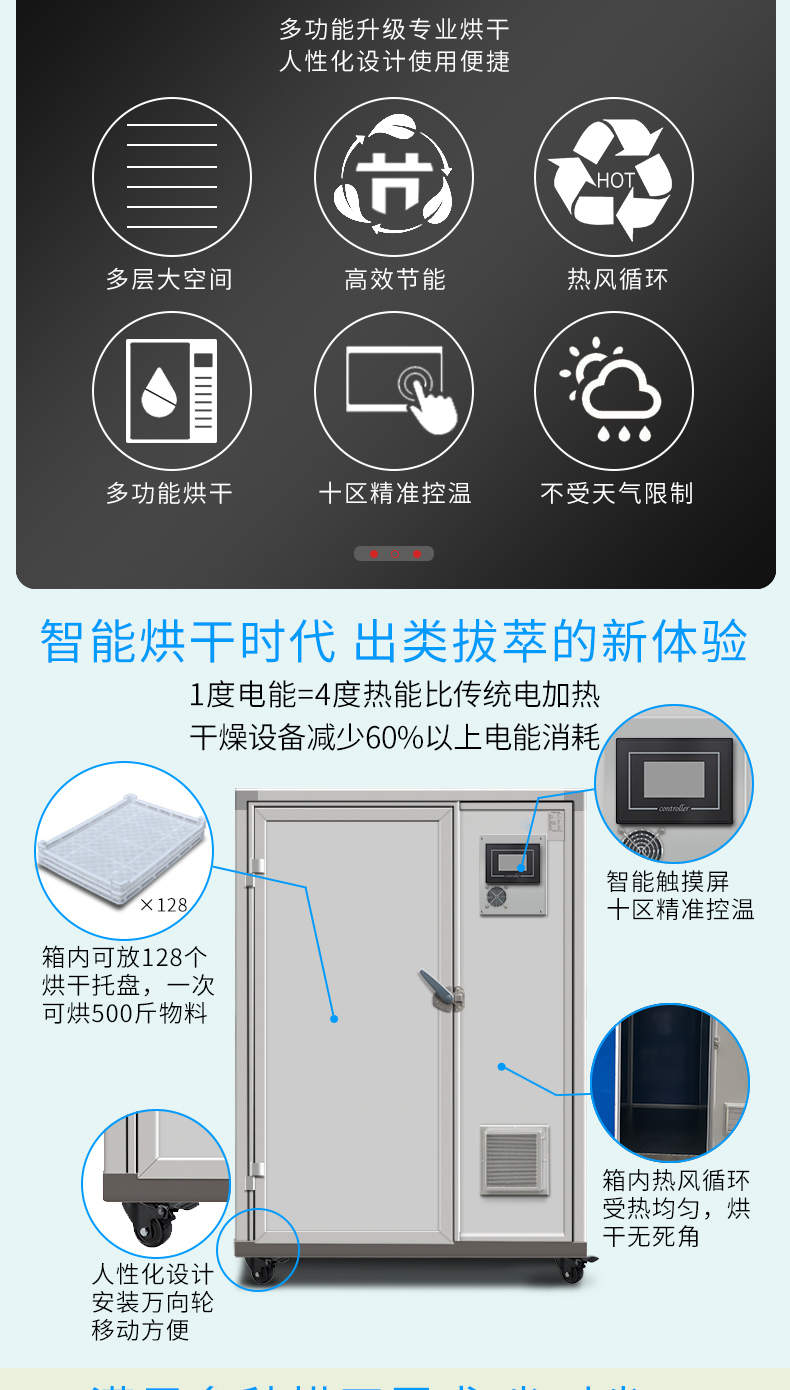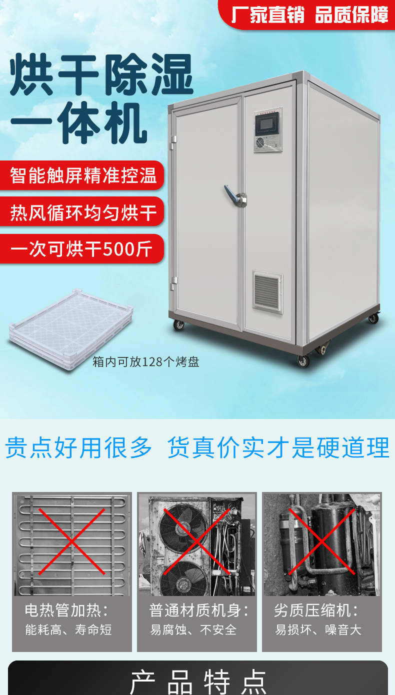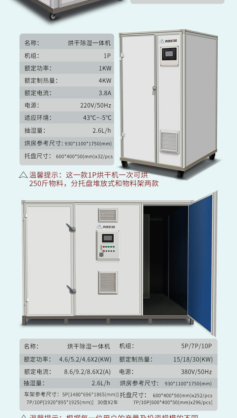 烘干除濕一體機,烘干除濕體機,智能觸屏精準控溫熱風循環均勻烘干次可烘干500斤,智能烘干時代出類拔萃的新體驗,1度電能=4度,熱能比傳統電加熱。干燥設備減少60%以上電能消耗。