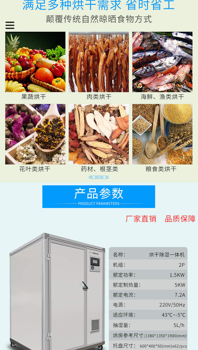 名稱烘干除濕一體機 電源220V/50Hz 功率1.5KW 產量抽濕量:5L/h 尺寸烘房參考:13801350·1900(mm)托盤尺寸:600·40050(mm)x×62/cs 重量聯系銷售員 規格額定制熱量5KW、額定電流:7.2A 其他適應環境43C~-5°C