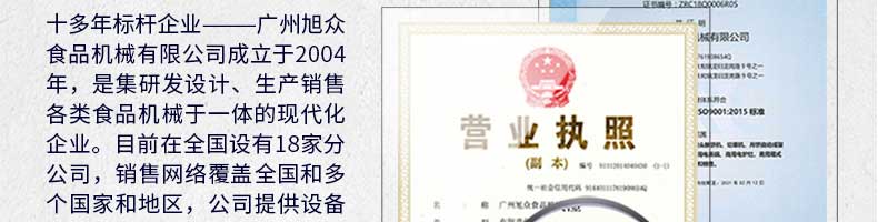 廣州旭眾食品機(jī)械有限公司是一家集科研開(kāi)發(fā),生產(chǎn)設(shè)計(jì),營(yíng)銷服務(wù)為一體的現(xiàn)代化生產(chǎn)企業(yè)。現(xiàn)代化生產(chǎn)車間,精湛制造技術(shù),所產(chǎn)機(jī)械歷經(jīng)市場(chǎng)重重考驗(yàn),不斷贏得海內(nèi)外客戶的贊譽(yù)。