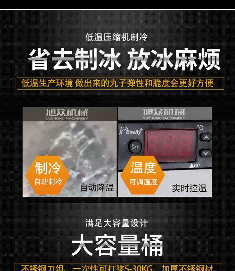 XZ-ZL-36制冷打漿機,滿足大容量設計,大容量桶不銹鋼刀俎、一次性可打漿530KG,加厚不銹鋼材。