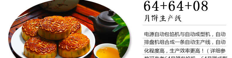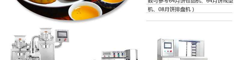 名稱月餅生產線 電源 功率 產量 尺寸 重量 規格 其他詳情參數請看SZ-64月餅成型機,SZ-64多功能包餡機,SZ-08型月餅自動排盤機